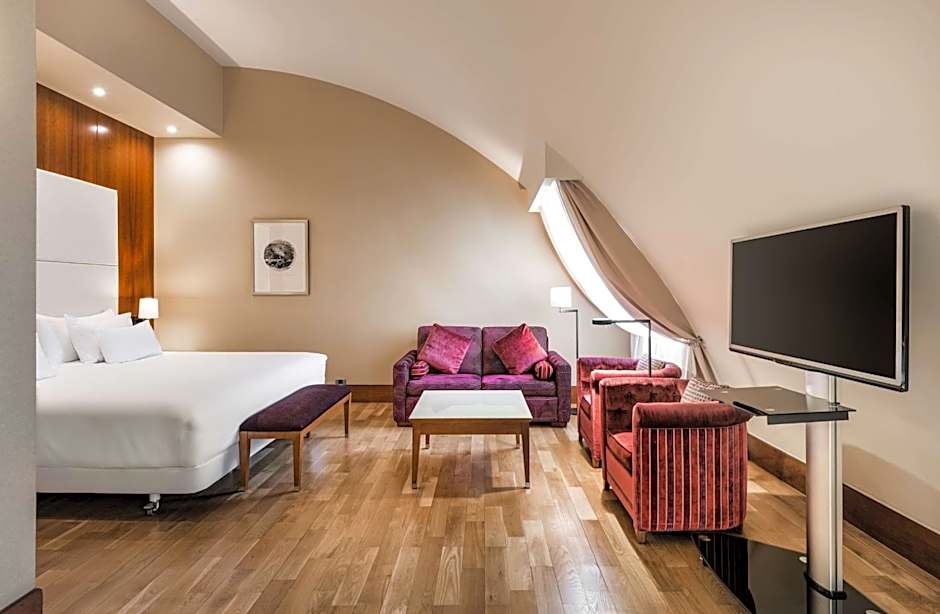 Featuring a living area with a 48-inch flat-screen TV, this elegant Junior Suite is located on the top floor and has sloping ceilings.